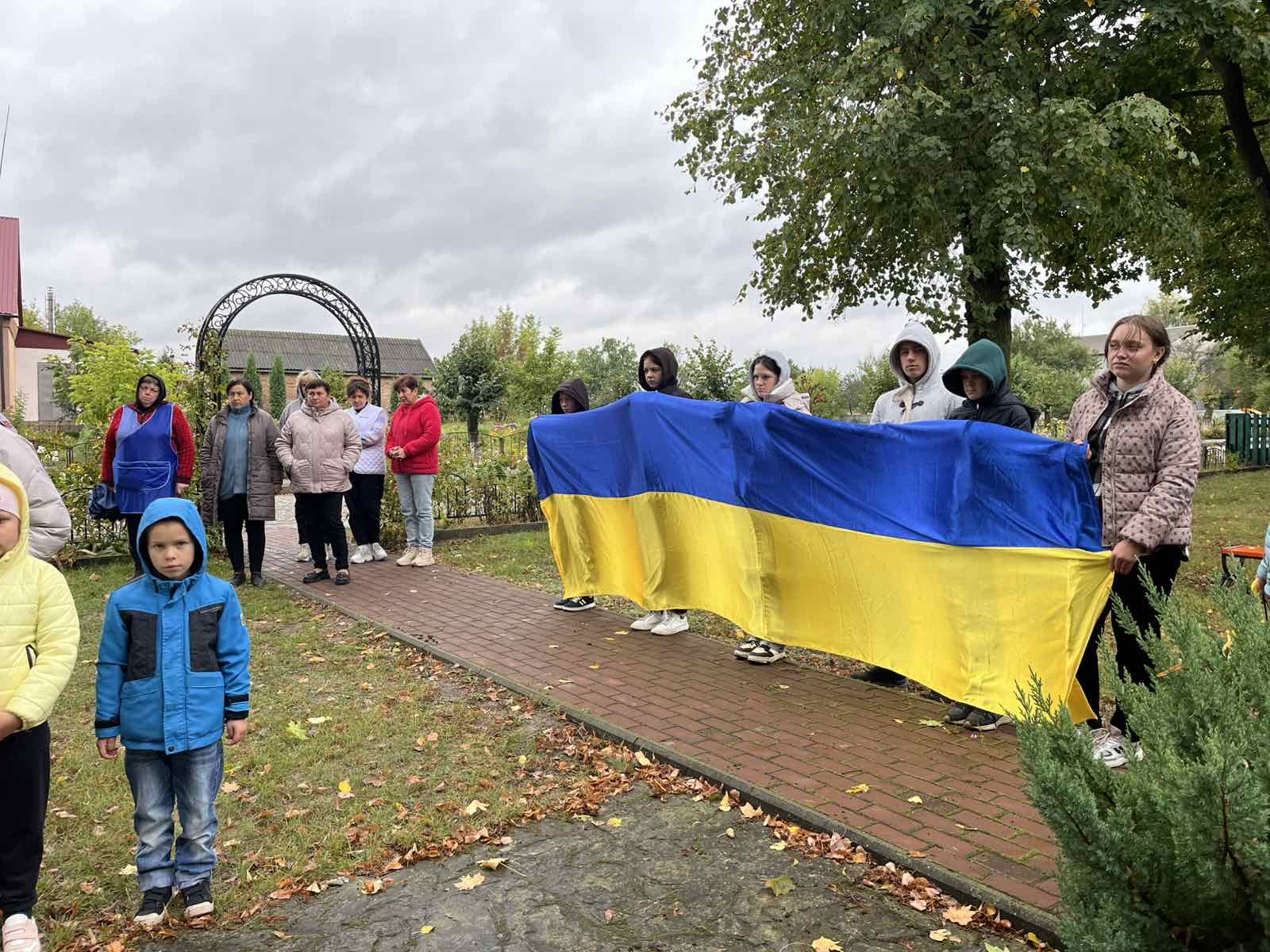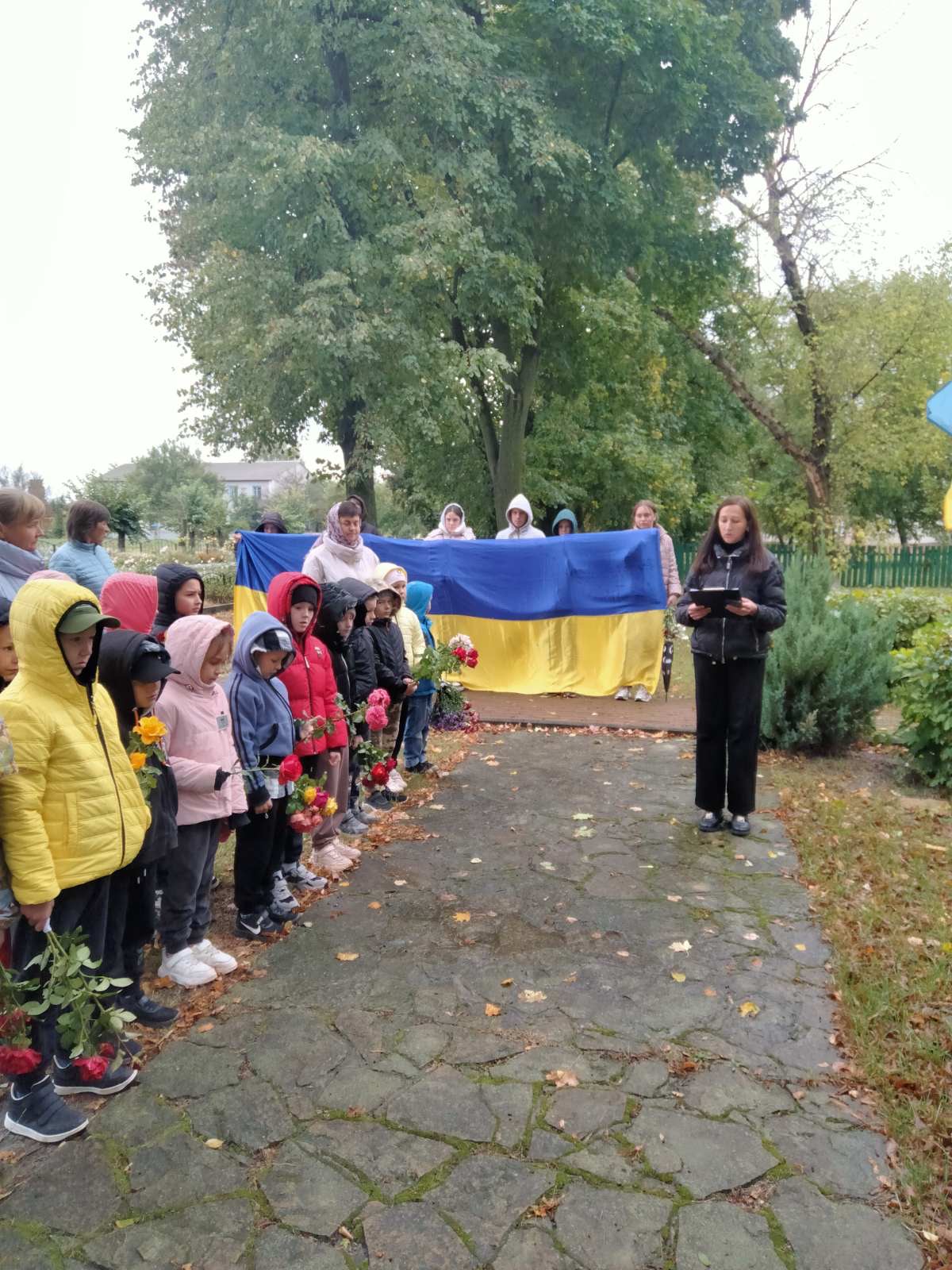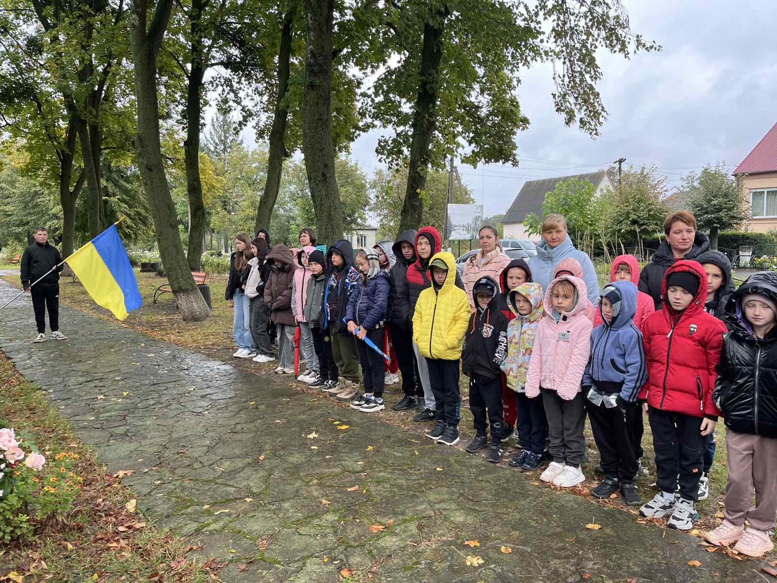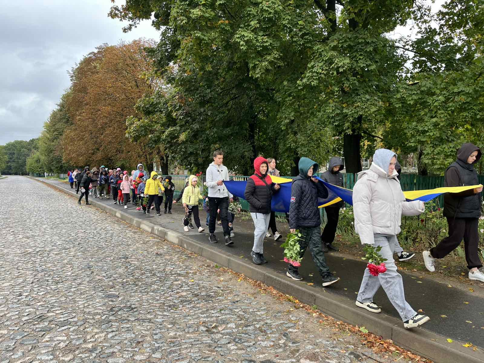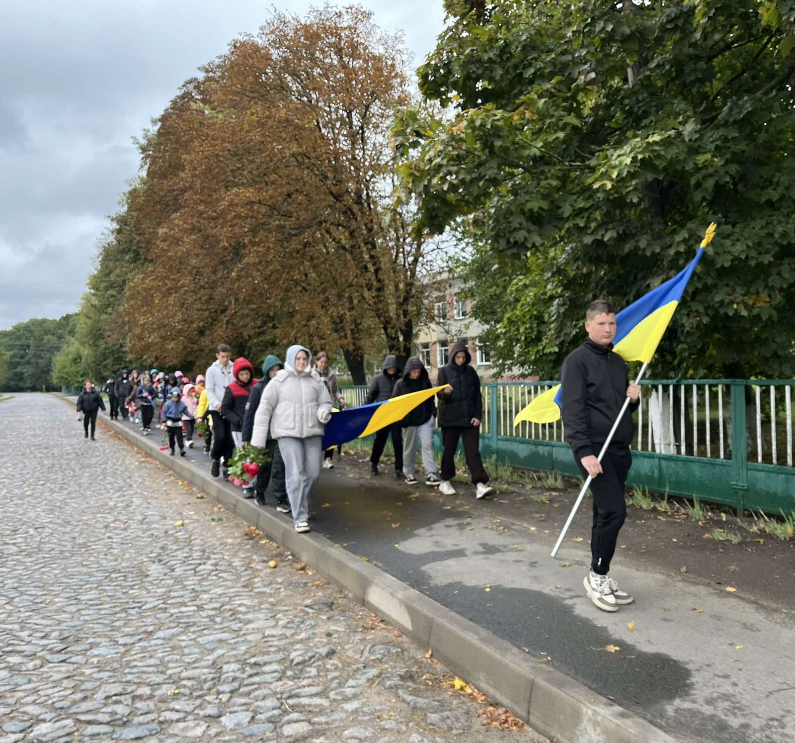 Зранку учні та педагогічний колектив долучилися до пам’ятної ходи з Державним Прапором України. Урочиста колона пройшла до патріотичних банерів, встановлених на території села. Біля банерів відбулася церемонія вшанування: хвилина мовчання, виконання Гімну України, покладання квітів — як символ глибокої шани й подяки всім, хто боронив і боронить нашу державу.