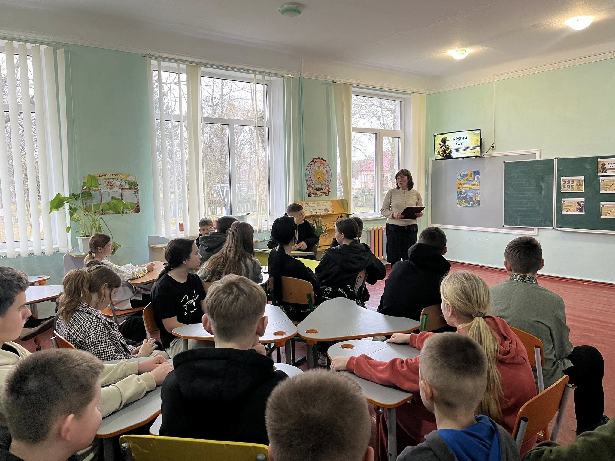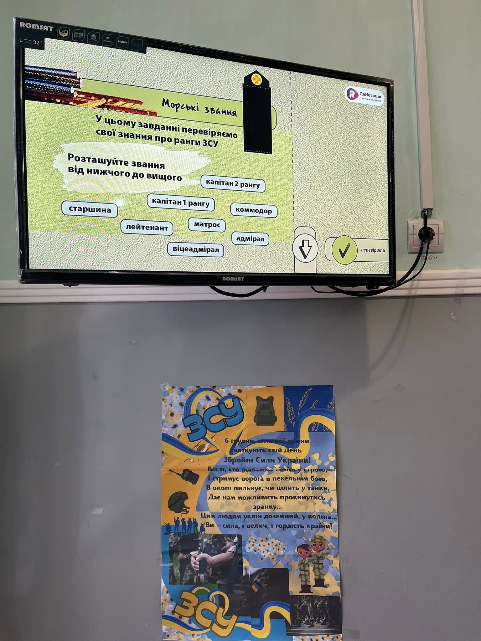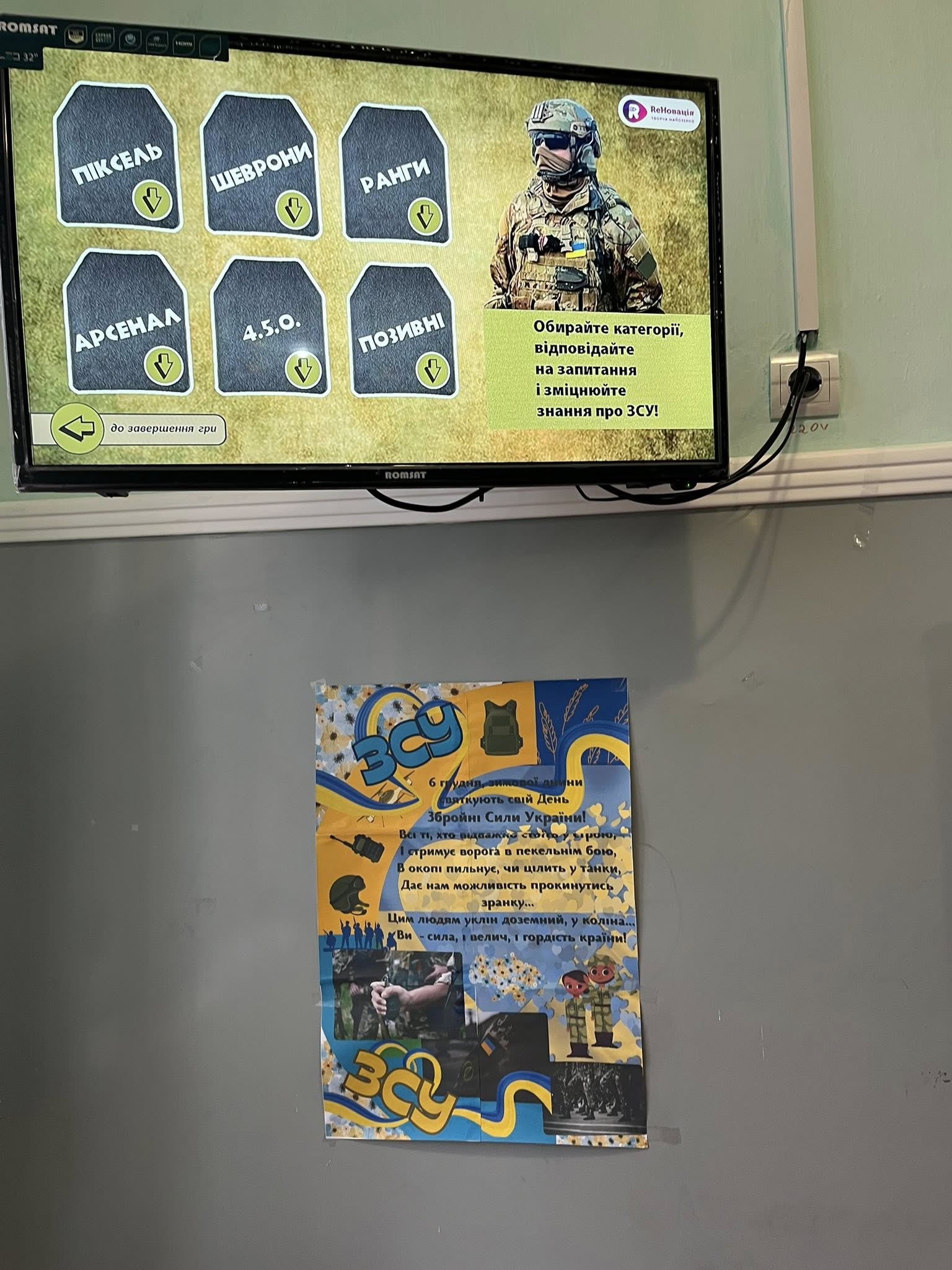 У межах заходу для учнів 5-9 класів була проведена гра-вікторина «Броня для ЗСУ». Під час перегляду команди учасників давали відповіді на запитання,демонструючи уважність,командний дух та знання про Збройні Сили.Учні зміцнили та розширили свої знання в категоріях «Піксель», «Шеврони», «Ранги», «Арсенал», «4.5.0», «Позивні».